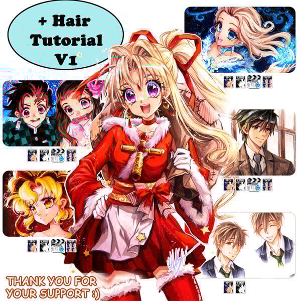 Here you will get the whole package from 6 Colored Artworks, 6 Highresolution Images, 6 video prosesses and 6 work in progress files and 6 lineart for coloring yourself.